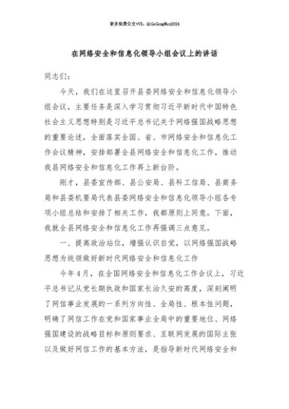/ 【七哥公文】2024年:在网络安全和信息化领导小组会议上的讲话+更多免费公文+VX:QiGeGongWen2024