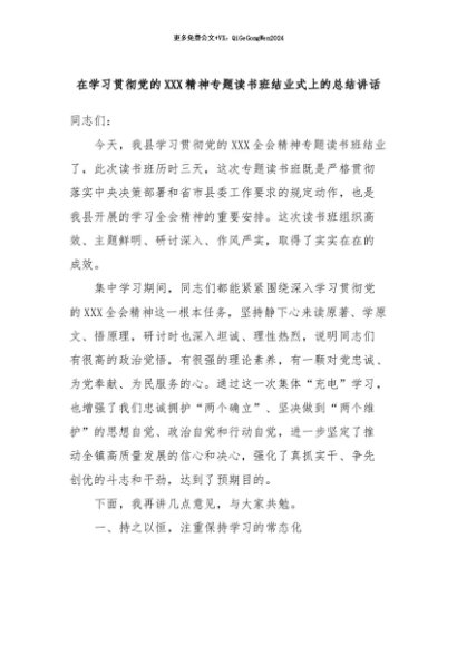 【七哥公文】2024年:在学习贯彻党的XXX精神专题读书班结业式上的总结讲话+更多免费公文+VX:QiGeGongWen2024