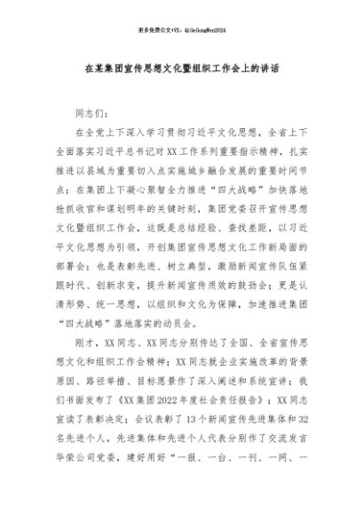 / 【七哥公文】2024年:在某集团宣传思想文化暨组织工作会上的讲话+更多免费公文+VX:QiGeGongWen2024