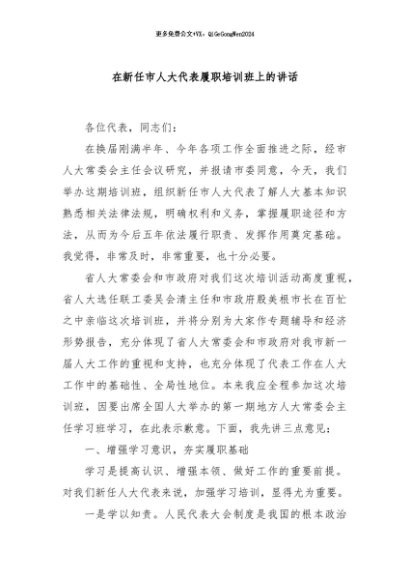 / 【七哥公文】2024年:在新任市人大代表履职培训班上的讲话+更多免费公文+VX:QiGeGongWen2024