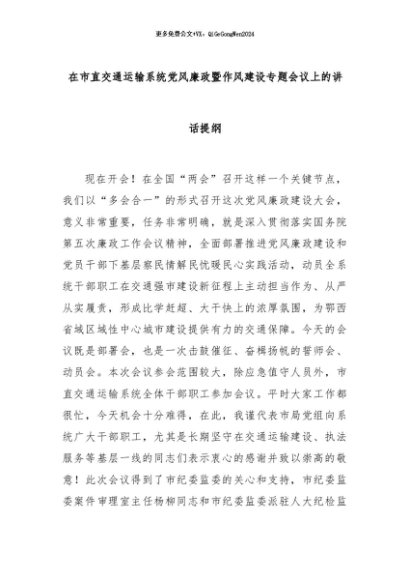 【七哥公文】2024年:在市直交通运输系统党风廉政暨作风建设专题会议上的讲话提纲+更多免费公文+VX:QiGeGongWen2024