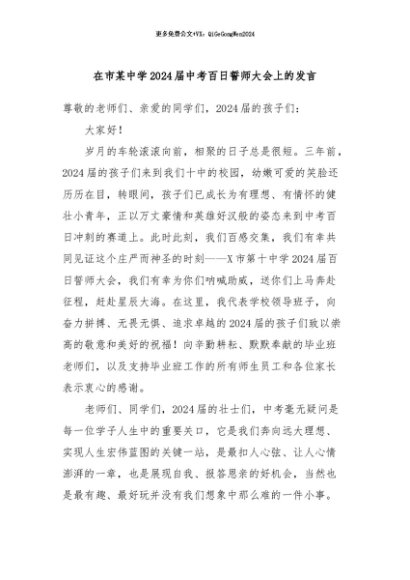 / 【七哥公文】2024年:在市某中学2024届中考百日誓师大会上的发言+更多免费公文+VX:QiGeGongWen2024