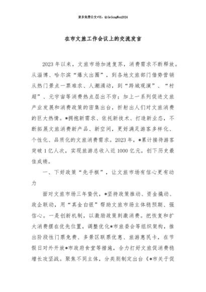 / 【七哥公文】2024年:在市文旅工作会议上的交流发言+更多免费公文+VX:QiGeGongWen2024
