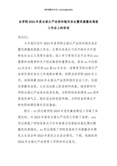 【七哥公文】2024年:在学院2024年度全面从严治党和稳定安全暨巡察整改通报工作会上的讲话+更多免费公文+VX:QiGeGongWen2024