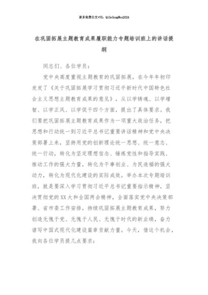 【七哥公文】2024年:在巩固拓展主题教育成果履职能力专题培训班上的讲话提纲+更多免费公文+VX:QiGeGongWen2024