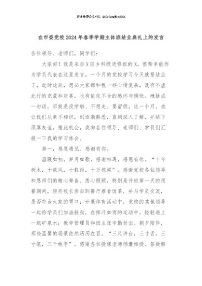 【七哥公文】2024年:在市委党校2024年春季学期主体班结业典礼上的发言+更多免费公文+VX:QiGeGongWen2024