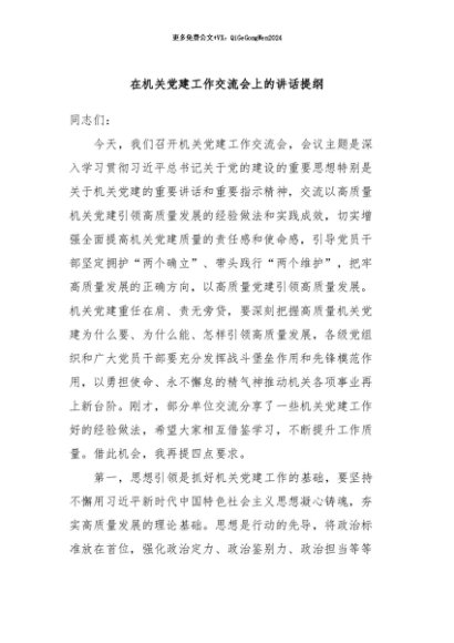 / 【七哥公文】2024年:在机关党建工作交流会上的讲话提纲+更多免费公文+VX:QiGeGongWen2024