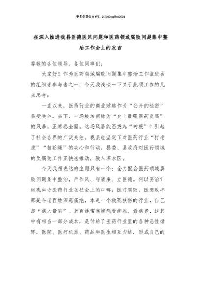 【七哥公文】2024年:在深入推进我县医德医风问题和医药领域腐败问题集中整治工作会上的发言+更多免费公文+VX:QiGeGongWen2024