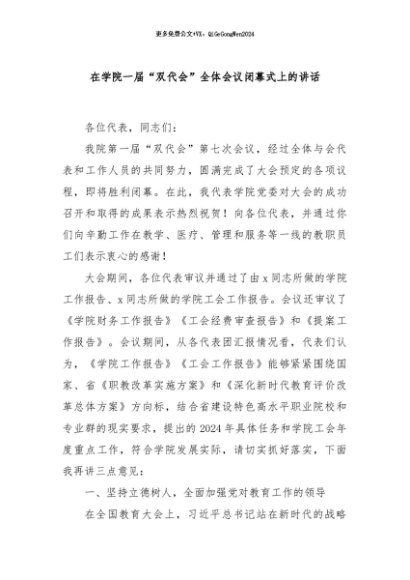 / 【七哥公文】2024年:在学院一届“双代会”全体会议闭幕式上的讲话+更多免费公文+VX:QiGeGongWen2024