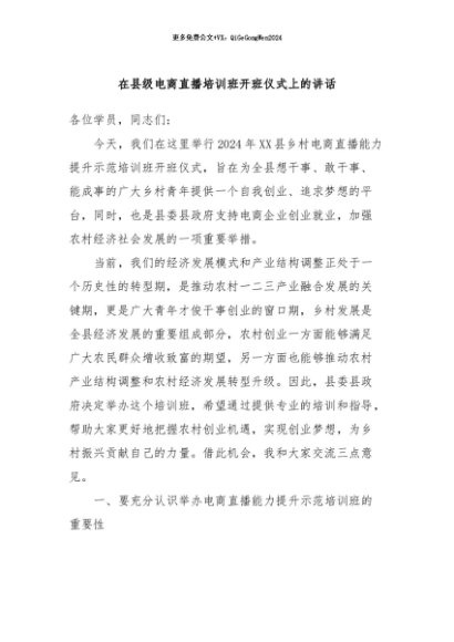 / 【七哥公文】2024年:在县级电商直播培训班开班仪式上的讲话+更多免费公文+VX:QiGeGongWen2024