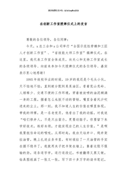 【七哥公文】2024年:在创新工作室授牌仪式上的发言+更多免费公文+VX:QiGeGongWen2024