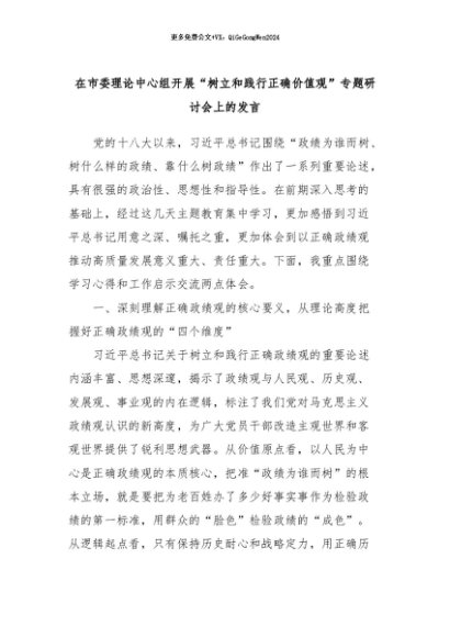 【七哥公文】2024年:在市委理论中心组开展“树立和践行正确价值观”专题研讨会上的发言+更多免费公文+VX:QiGeGongWen2024