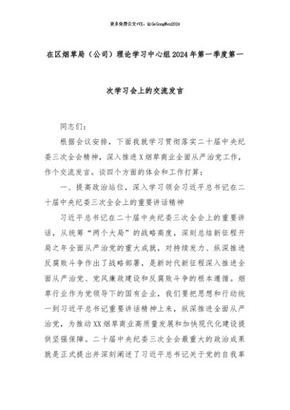 【七哥公文】2024年:在区烟草局(公司)理论学习中心组2024年第一季度第一次学习会上的交流发言+更多免费公文+VX:QiGeGongWen2024