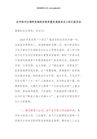 【七哥公文】2024年:在市委书记调研县域经济高质量发展座谈会上的汇报发言+更多免费公文+VX:QiGeGongWen2024