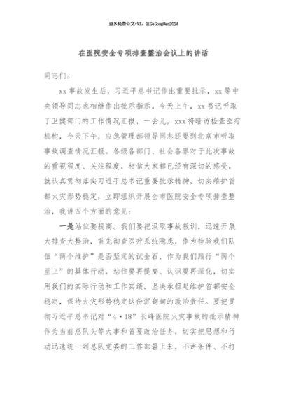 / 【七哥公文】2024年:在医院安全专项排查整治会议上的讲话+更多免费公文+VX:QiGeGongWen2024
