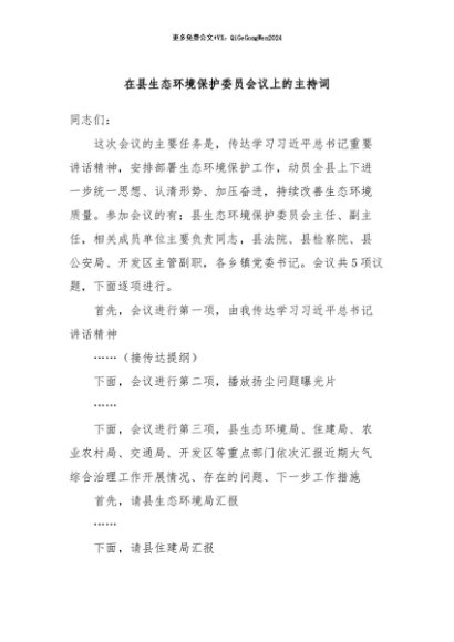 / 【七哥公文】2024年:在县生态环境保护委员会议上的主持词+更多免费公文+VX:QiGeGongWen2024
