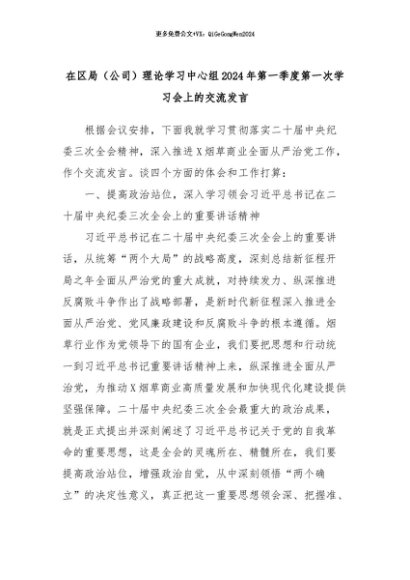 【七哥公文】2024年:在区局(公司)理论学习中心组2024年第一季度第一次学习会上的交流发言+更多免费公文+VX:QiGeGongWen2024