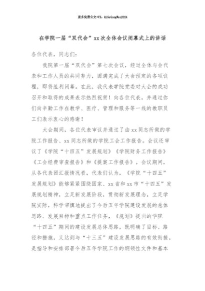 / 【七哥公文】2024年:在学院一届“双代会”xx次全体会议闭幕式上的讲话+更多免费公文+VX:QiGeGongWen2024