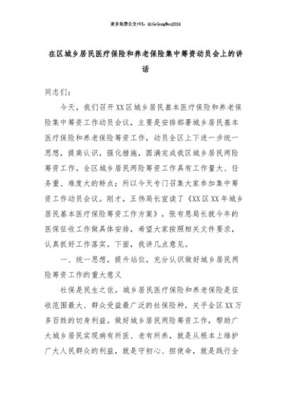 【七哥公文】2024年:在区城乡居民医疗保险和养老保险集中筹资动员会上的讲话+更多免费公文+VX:QiGeGongWen2024