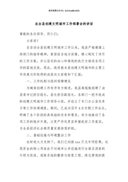 / 【七哥公文】2024年:在全县创建文明城市工作部署会的讲话+更多免费公文+VX:QiGeGongWen2024