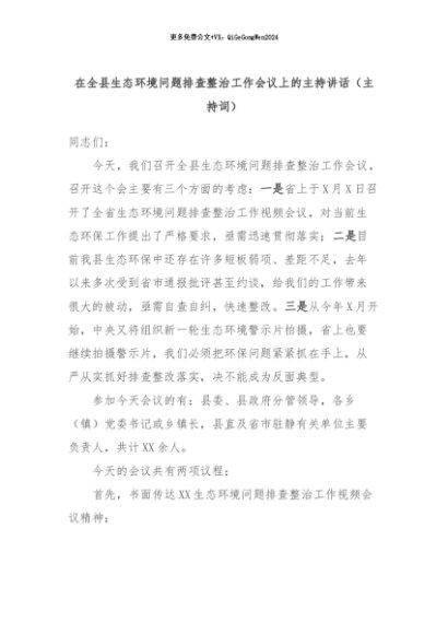 【七哥公文】2024年:在全县生态环境问题排查整治工作会议上的主持讲话(主持词)+更多免费公文+VX:QiGeGongWen2024