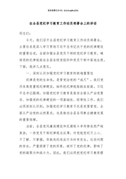 / 【七哥公文】2024年:在全县党纪学习教育工作动员部署会上的讲话+更多免费公文+VX:QiGeGongWen2024