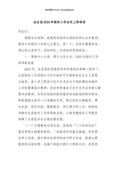 / 【七哥公文】2024年:在全县2024年组织工作会议上的讲话+更多免费公文+VX:QiGeGongWen2024