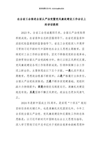 【七哥公文】2024年:在全省工会推进全面从严治党暨党风廉政建设工作会议上的讲话提纲+更多免费公文+VX:QiGeGongWen2024