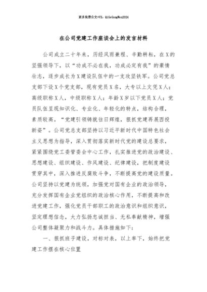 / 【七哥公文】2024年:在公司党建工作座谈会上的发言材料+更多免费公文+VX:QiGeGongWen2024