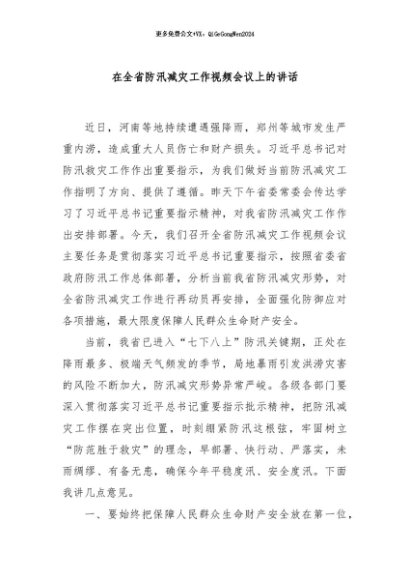 / 【七哥公文】2024年:在全省防汛减灾工作视频会议上的讲话+更多免费公文+VX:QiGeGongWen2024