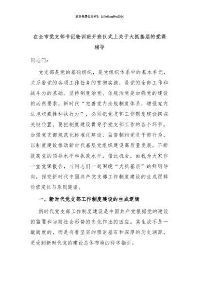 【七哥公文】2024年:在全市党支部书记轮训班开班仪式上关于大抓基层的党课辅导+更多免费公文+VX:QiGeGongWen2024