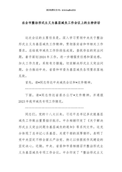 / 【七哥公文】2024年:在全市整治形式主义为基层减负工作会议上的主持讲话+更多免费公文+VX:QiGeGongWen2024
