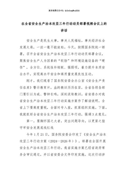 【七哥公文】2024年:在全省安全生产治本攻坚三年行动动员部署视频会议上的讲话+更多免费公文+VX:QiGeGongWen2024