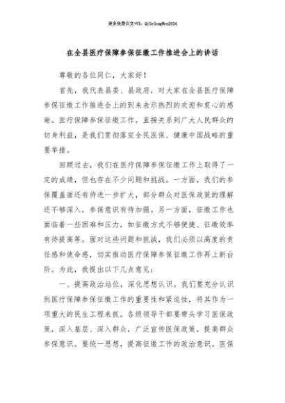 / 【七哥公文】2024年:在全县医疗保障参保征缴工作推进会上的讲话+更多免费公文+VX:QiGeGongWen2024