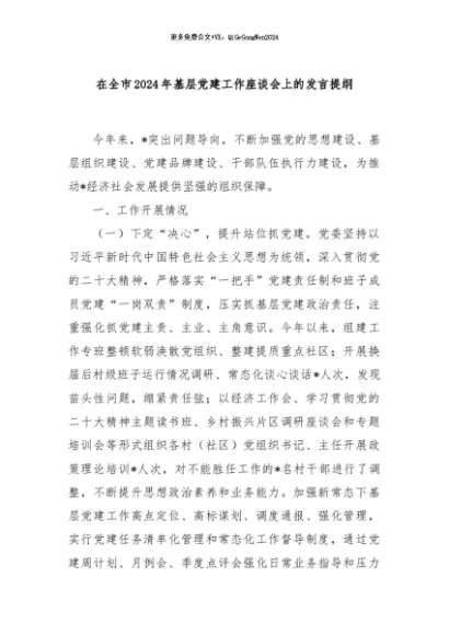 / 【七哥公文】2024年:在全市2024年基层党建工作座谈会上的发言提纲+更多免费公文+VX:QiGeGongWen2024