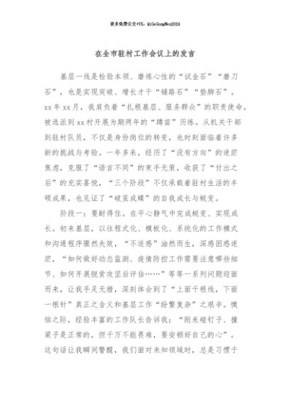 / 【七哥公文】2024年:在全市驻村工作会议上的发言+更多免费公文+VX:QiGeGongWen2024