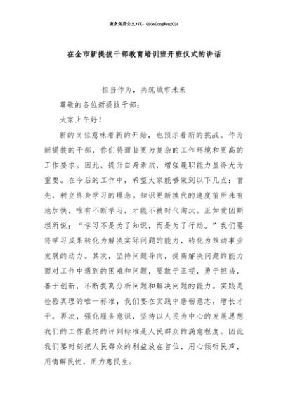 / 【七哥公文】2024年:在全市新提拔干部教育培训班开班仪式的讲话+更多免费公文+VX:QiGeGongWen2024