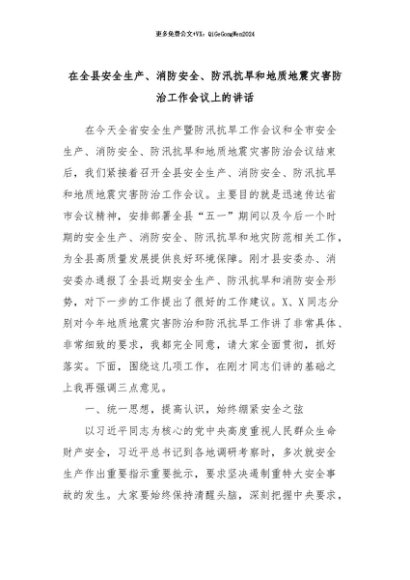 【七哥公文】2024年:在全县安全生产、消防安全、防汛抗旱和地质地震灾害防治工作会议上的讲话+更多免费公文+VX:QiGeGongWen2024