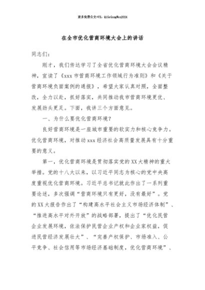 / 【七哥公文】2024年:在全市优化营商环境大会上的讲话+更多免费公文+VX:QiGeGongWen2024