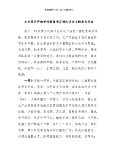 / 【七哥公文】2024年:在全面从严治党考核督查反馈约谈会上的表态发言+更多免费公文+VX:QiGeGongWen2024