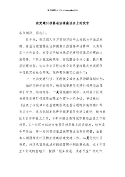 / 【七哥公文】2024年:在党建引领基层治理座谈会上的发言+更多免费公文+VX:QiGeGongWen2024