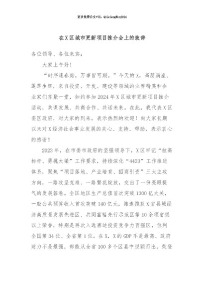 / 【七哥公文】2024年:在X区城市更新项目推介会上的致辞+更多免费公文+VX:QiGeGongWen2024