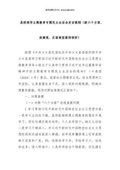 【七哥公文】2024年:县级领导主题教育专题民主生活会发言提纲(新六个方面、政绩观、反面典型案例剖析)+更多免费公文+VX:QiGeGongWen2024