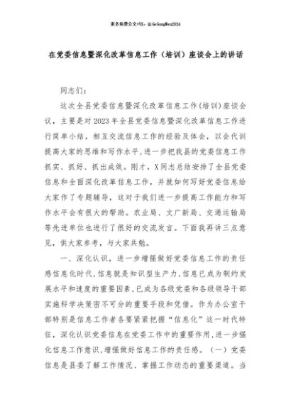 【七哥公文】2024年:在党委信息暨深化改革信息工作(培训)座谈会上的讲话+更多免费公文+VX:QiGeGongWen2024