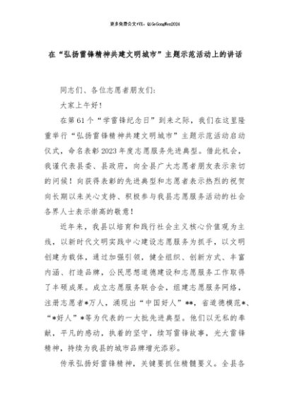【七哥公文】2024年:在“弘扬雷锋精神共建文明城市”主题示范活动上的讲话+更多免费公文+VX:QiGeGongWen2024