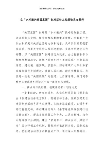 / 【七哥公文】2024年:在“乡村振兴美丽家园”创建活动上的经验发言材料+更多免费公文+VX:QiGeGongWen2024