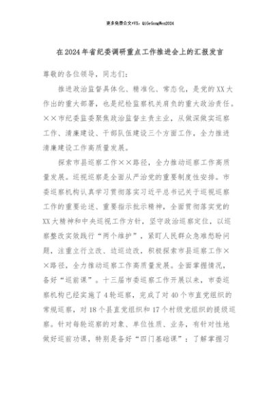 / 【七哥公文】2024年:在2024年省纪委调研重点工作推进会上的汇报发言+更多免费公文+VX:QiGeGongWen2024