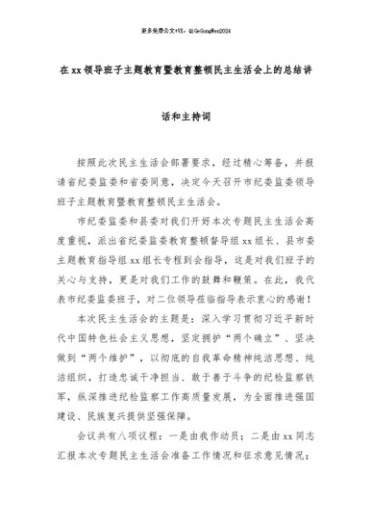 【七哥公文】2024年:在xx领导班子主题教育暨教育整顿民主生活会上的总结讲话和主持词.+更多免费公文+VX:QiGeGongWen2024