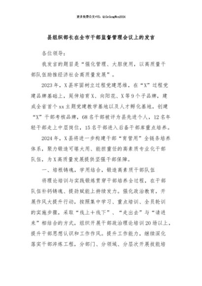 / 【七哥公文】2024年:县组织部长在全市干部监督管理会议上的发言+更多免费公文+VX:QiGeGongWen2024