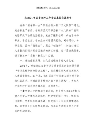 / 【七哥公文】2024年:在2024年省委农村工作会议上的交流发言+更多免费公文+VX:QiGeGongWen2024